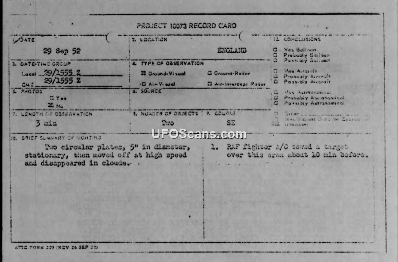 Project 10073 Record Card — Sighting Report, England, 29 September 1952