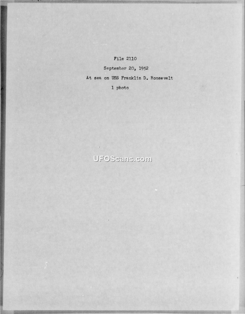 This document is a brief administrative record identified as File 2110, dated September 20, 1952. The document indicates that an event occurred while at sea aboard the USS Franklin D. Roosevelt. The record explicitly notes the inclusion of one photograph as part of the file. No further details regarding the nature of the event, the observers, or the specific circumstances of the sighting are provided in the text.