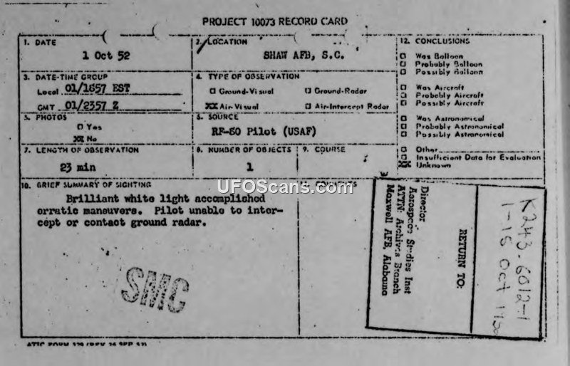 Report of Sighting of Unconventional Aircraft — Shaw Air Force Base, 1 October 1952