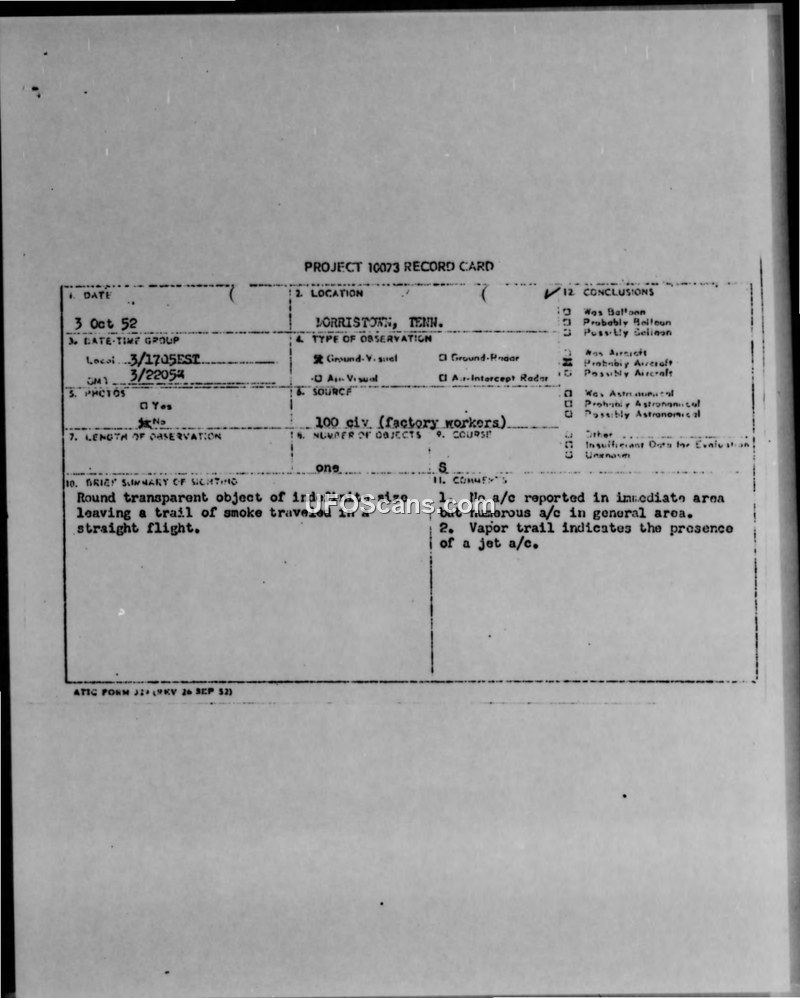 On October 3, 1952, 100 factory workers in Morristown, Tennessee, reported a round, transparent object with a smoke trail. The Air Force concluded it was likely a jet aircraft, noting no radar contact was made.