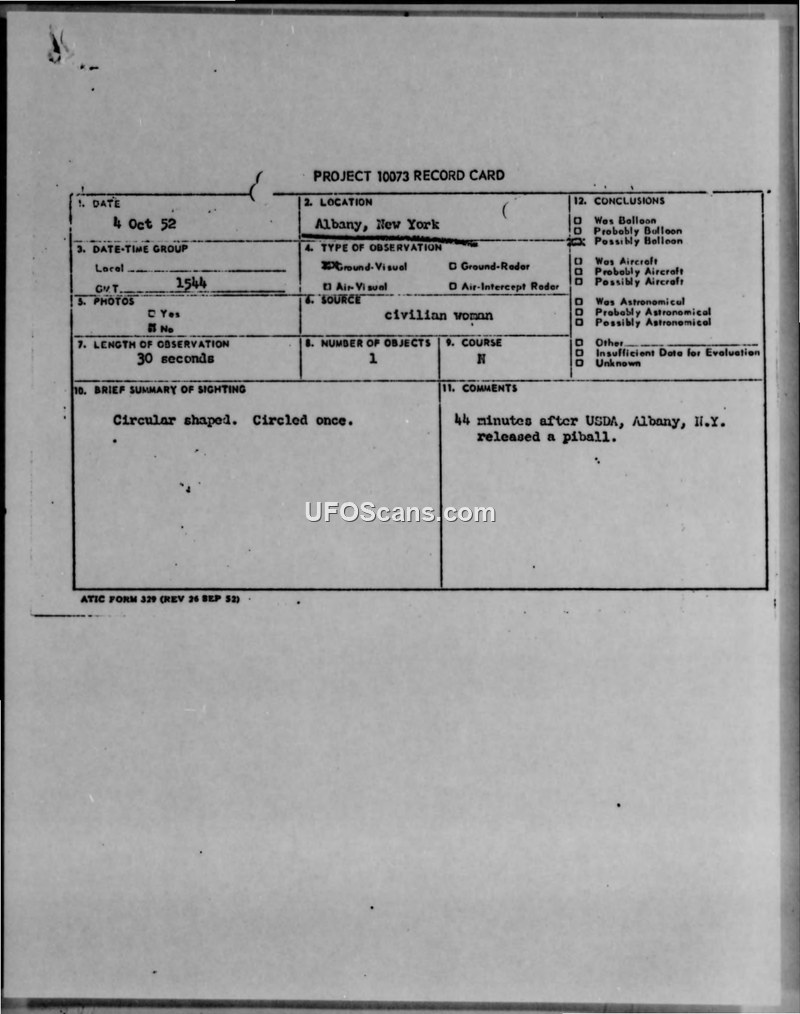 A civilian in Albany, NY, reported a circular, fast-moving object on October 4, 1952. Military authorities concluded the object was likely a pilot balloon released by the USDA 44 minutes earlier.