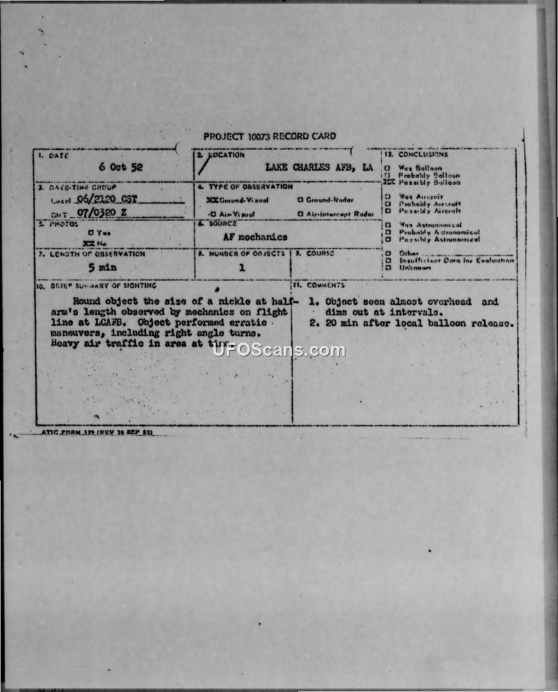 Three Air Force mechanics observed a round, white, unidentified object performing erratic maneuvers and right-angle turns over Lake Charles AFB on October 6, 1952. The sighting lasted five minutes and occurred 20 minutes after a local balloon release.