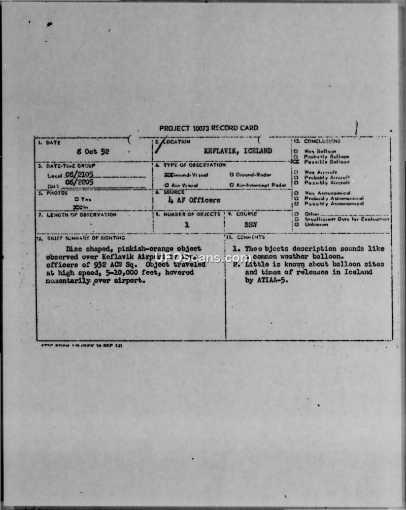 On October 8, 1952, at approximately 2105 local time, four officers from the 932nd ACW Squadron observed an unidentified flying object over Keflavik Airport, Iceland. The object was described as disc-shaped and pinkish-orange in color. Witnesses estimated the object to be approximately 50 feet in diameter and traveling at an altitude between 5,000 and 10,000 feet. The object was observed to hover momentarily over the airport before gaining altitude rapidly and disappearing. The total duration of the sighting was estimated at approximately six seconds. The witnesses reported no visible exhaust, vapor trails, air turbulence, or sound associated with the object. Weather conditions at the time were clear, with no cloud cover and minimal surface wind. Local Ground Controlled Approach (GCA) and airport control towers reported no corresponding sightings. The official evaluation, authored by Captain Milton Radovsky of the 1400th Air Base Group, concluded that the description of the object was consistent with a common weather balloon. The report noted that while weather balloons were released daily around 2100, the specific balloon released on October 8 was not colored. However, the report suggested that the object could have been a balloon reflecting sunlight, or that its apparent speed and movement could be attributed to wind conditions. The document includes a sketch of the object's appearance and flight path. It is noted that little information was available regarding the specific balloon release schedules in Iceland managed by ATIAA-5 at the time of the incident.