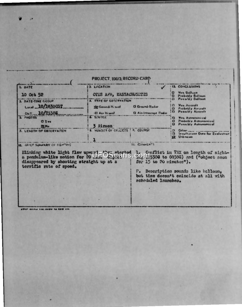 Project 10073 Record Card: Sighting at Otis AFB, Massachusetts, 10 October 1952