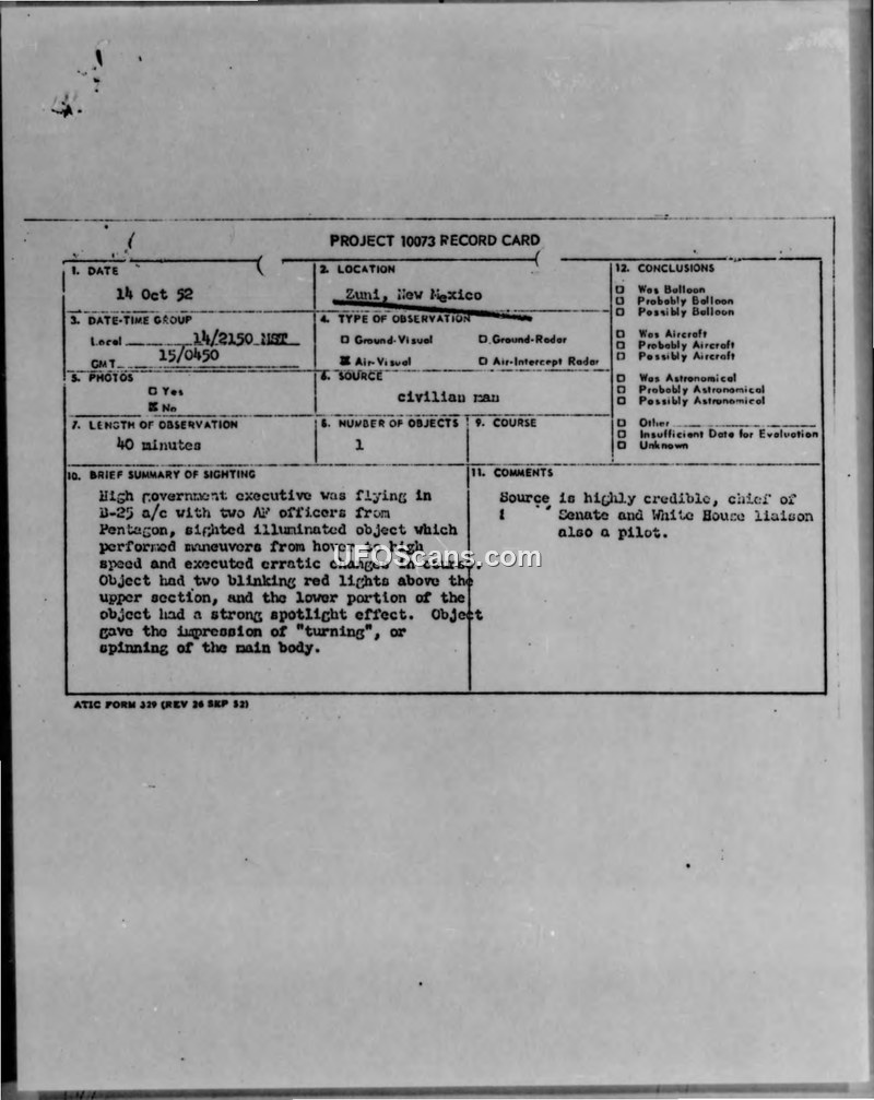 A government executive and pilot reported a 40-minute sighting of a large, metallic, high-speed object near Zuni, New Mexico, on October 14, 1952. The witness, considered highly credible, described maneuvers that exceeded known aeronautical capabilities.