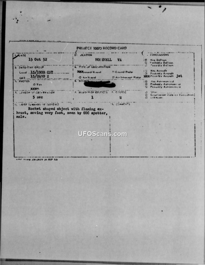 On October 15, 1952, a GOC spotter in Hopewell, Virginia, reported a high-speed, rocket-shaped object with a flaming exhaust. The official military evaluation categorized the sighting as 'Possibly Aircraft (Jet).'