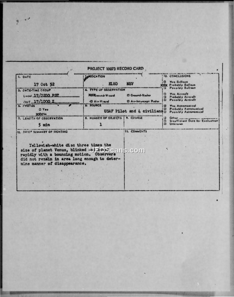 A USAF pilot and four civilians reported a disk-shaped object near Elko, Nevada, on 17 October 1952. The Air Technical Intelligence Center officially concluded the object was 'Probably Balloon'.