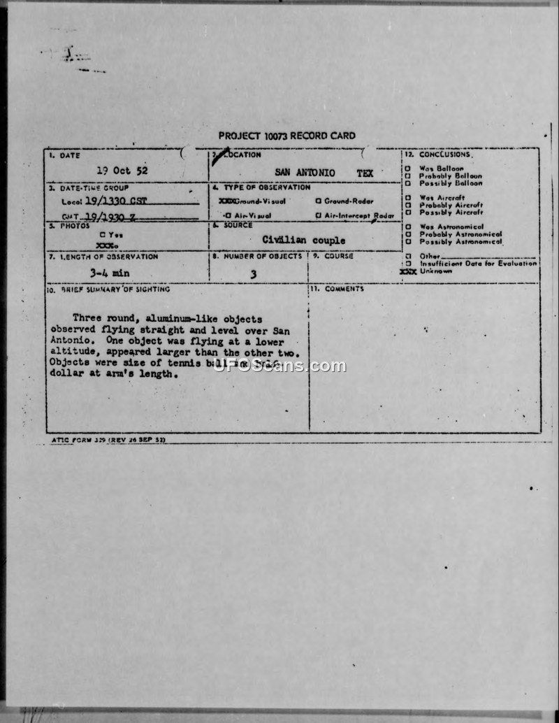 Project 10073 Record Card — San Antonio, Texas, 19 October 1952