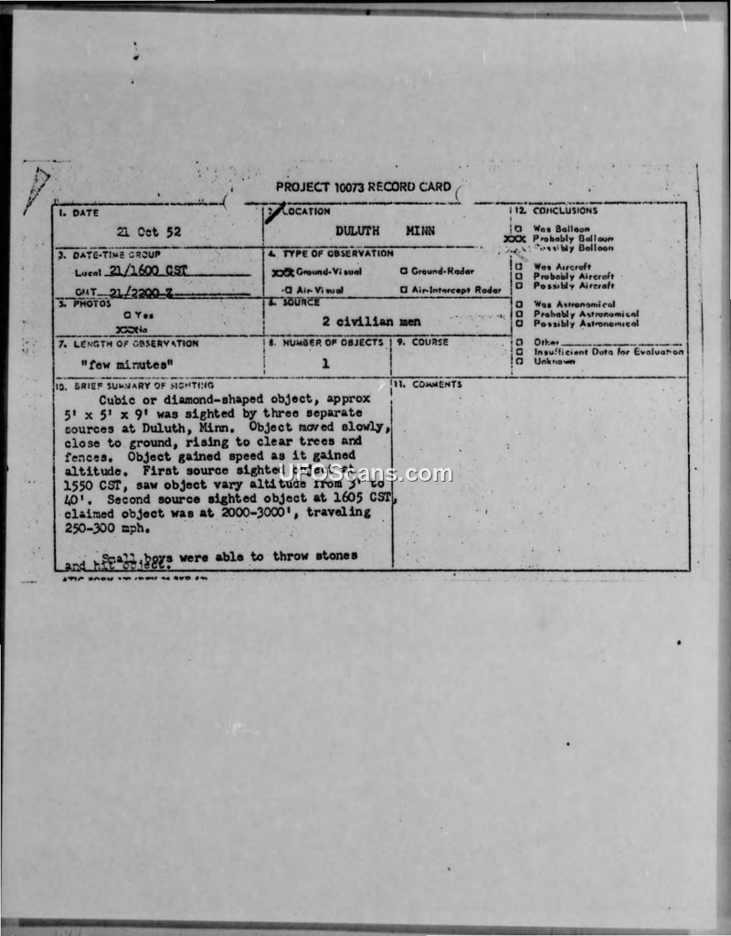 Project 10073 Record Card and Air Intelligence Information Report — Duluth, Minnesota, 21 October 1952