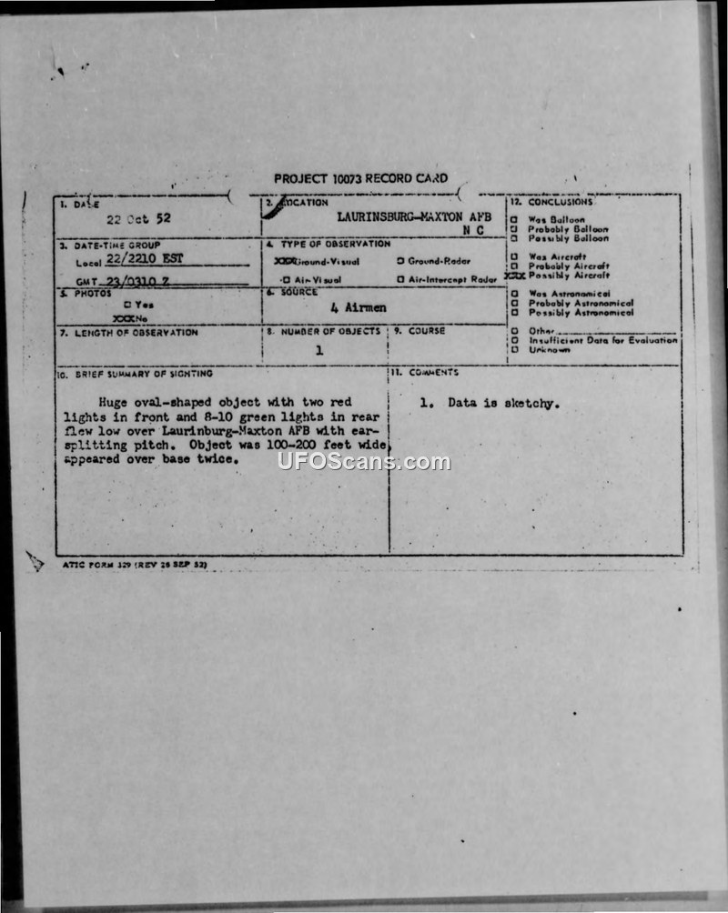Four airmen at Laurinburg-Maxton AFB reported a large, oval-shaped object with steady red and green lights and an ear-splitting sound on 22 October 1952. The official military assessment concluded that the data provided was too sketchy for a definitive evaluation.