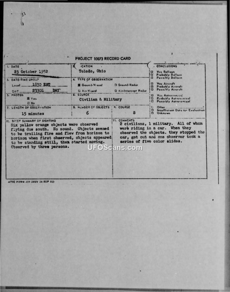 Project 10073 Record Card — Toledo, Ohio, 23 October 1952