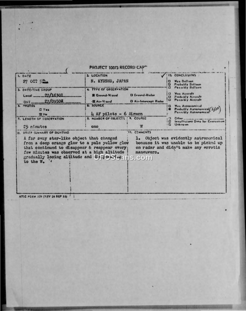 Multiple ground personnel in Northern Kyushu reported a star-like object on 27 October 1952 that could not be detected by radar. Intelligence officers concluded the sighting was likely a combination of a weather balloon, stars, or surface lights.