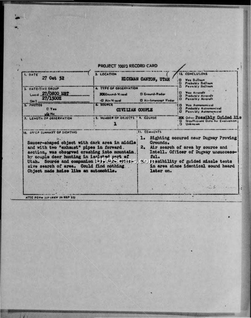 This document collection details a UFO sighting reported by two civilians on October 27, 1952, in the vicinity of Hickman Canyon, Utah. The witnesses, who were deer hunting in an isolated area, observed a saucer-shaped object with a dark center and two forward-facing exhaust pipes. They described the object as flying in a straight line at an altitude of approximately 3,000 feet before descending at a 15-degree angle and appearing to crash into South Mountain. The witnesses reported that the object produced a sound similar to an automobile or a high-speed car window defroster. Following the incident, the witnesses conducted their own search of the area but found no evidence of a crash or explosion. They subsequently reported the event to the Dugway Proving Ground. Military intelligence officers, including those from the 16th District Office of Special Investigations, were notified. An official air search of the area was conducted by Dugway personnel with negative results. The report notes that the witnesses later heard identical sounds in the area, leading to speculation that the phenomenon might be related to guided missile testing. The official conclusion recorded on the Project 10073 record card lists the event as having insufficient data for evaluation, while noting the possibility of guided missile tests. The file includes correspondence between the witnesses and military authorities, as well as detailed statements from the observers regarding their observations and subsequent attempts to investigate the site. The documents also contain maps and sketches of the flight path and the crash site area. The military authorities ultimately determined that no further investigative action was required under the provisions of Air Force Letter 200-5.