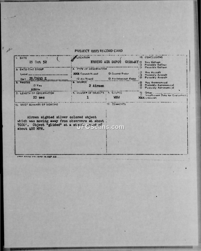 Two airmen at Erding Air Depot, Germany, reported a silent, silver, round object gliding at 400 MPH on October 29, 1952. The sighting lasted 20-30 seconds and was investigated by the 85th Air Depot Wing, which deemed the witnesses reliable.