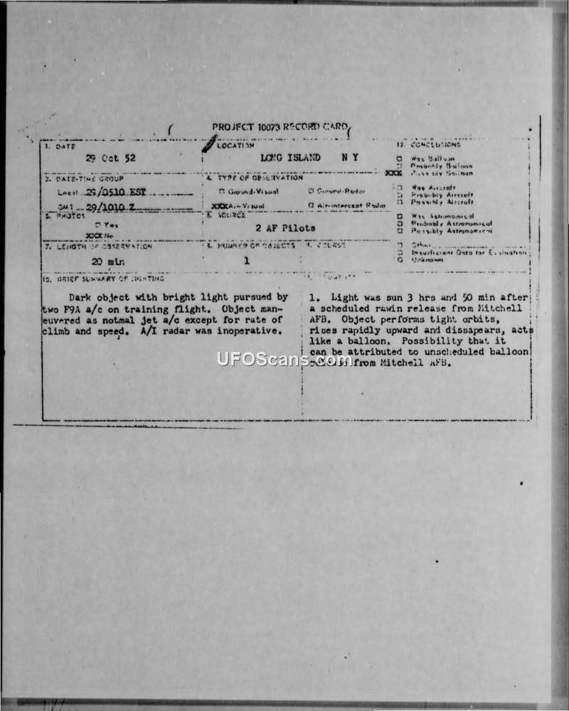 Project 10073 Record Card — Long Island, NY, 29 Oct 52