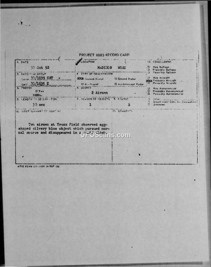 Two airmen at Truax Field reported an egg-shaped, silver object with a bluish cast on 30 October 1952. The official report suggests it may have been a Naval jet aircraft, noting inconsistencies between the estimated speed and the duration of the sighting.