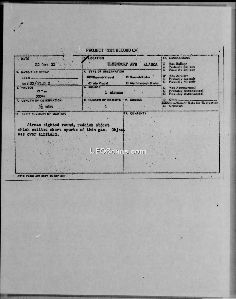 An Airman at Elmendorf AFB reported a round, reddish-orange object emitting gas over the airfield on October 22, 1952. The report was filed under Project 10073 and concluded there was insufficient data for evaluation.