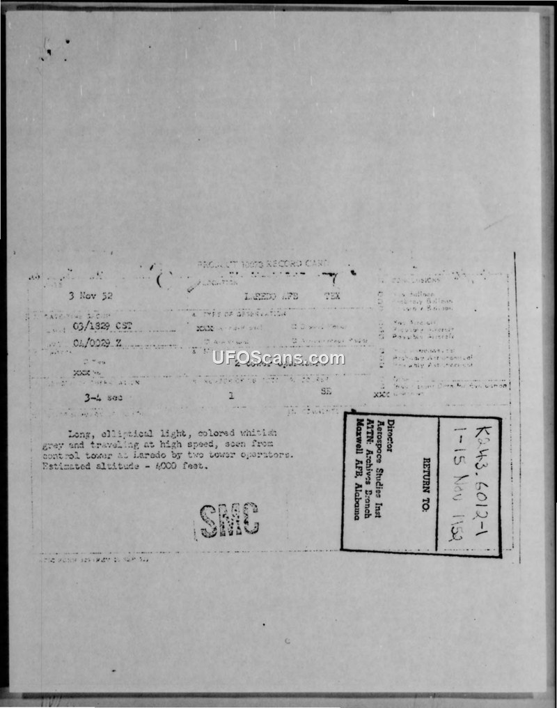 Two control tower operators at Laredo AFB reported a long, elliptical, metallic object on November 3, 1952. The object paused south of the base before accelerating rapidly to the southeast, with no sound or exhaust observed.