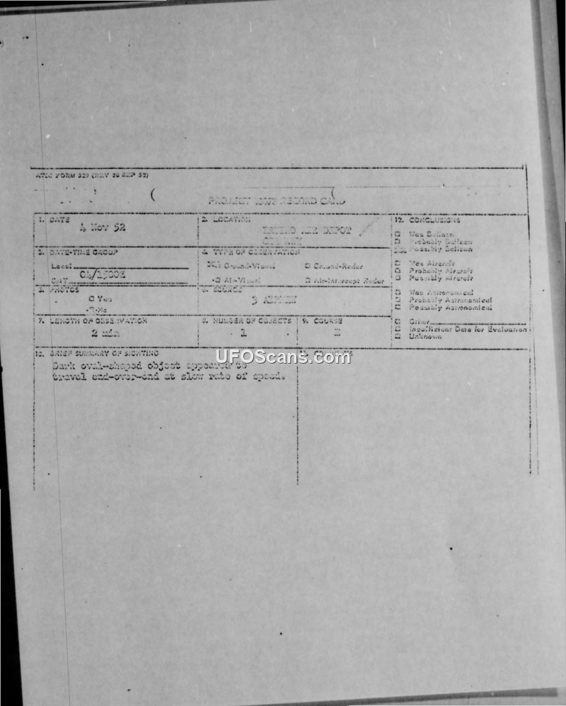 This document is a compilation of various sighting reports, correspondence, and administrative records related to Unidentified Aerial Phenomena (UAP) investigated under Project 10073 and Project Blue Book during 1952. The reports originate from diverse locations, including military installations in the United States, Korea, and Canada. The sightings involve a wide range of descriptions, from 'oval-shaped' objects and 'bright balls of flame' to 'red, green, and white lights' that exhibited rapid, erratic movements, including zig-zagging, hovering, and sudden changes in direction. Several reports involve military personnel, including pilots and radar operators, who provided detailed accounts of their observations. For instance, one report details a T-6 aircraft pilot observing a silver spherical object near a target area in Korea, while another report from the 767th AC&W Squadron describes radar blips that were initially suspected to be interference but remained on the scope after frequency changes. The document also includes correspondence regarding the submission of 8mm film by a civilian, which was analyzed by the Air Force and ultimately deemed to show only 'blobs of light' likely caused by reflections from the sun. The administrative records reflect the Air Force's systematic approach to collecting, evaluating, and attempting to correlate these sightings with known phenomena such as weather balloons, aircraft, and radar anomalies. Many of the reports conclude that the sightings remain unidentified due to insufficient data, though some are explicitly attributed to weather balloons or radar interference. The collection highlights the challenges faced by the Air Force in distinguishing between conventional phenomena and truly anomalous aerial objects during the early 1950s.