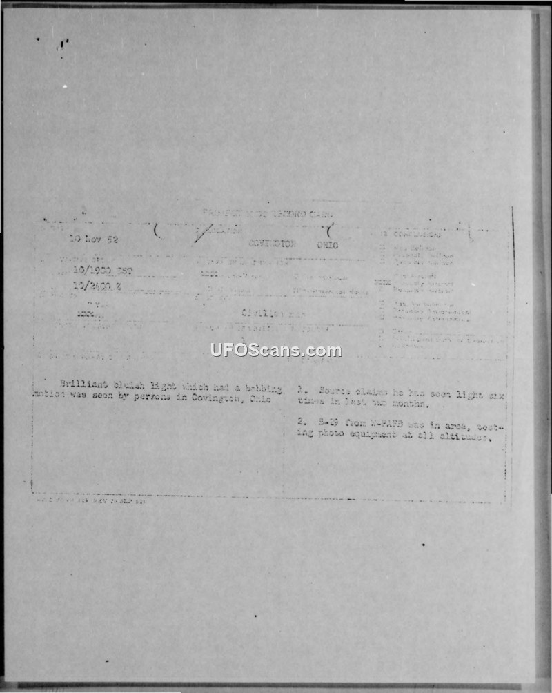 A witness in Covington, Ohio, reported a recurring brilliant bluish light. The Air Force identified the object as a B-29 aircraft from Wright-Patterson AFB conducting photo equipment tests.