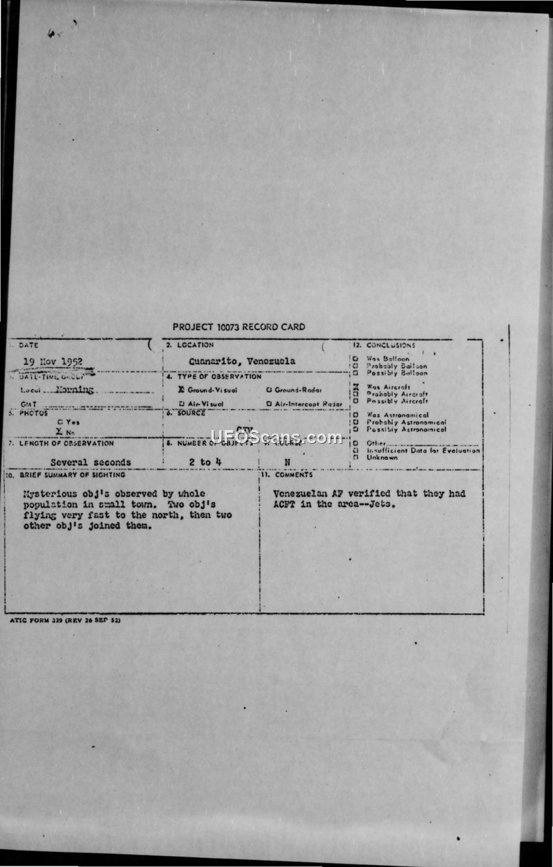 A sighting of unidentified objects by the population of Guanarito, Venezuela, on November 19, 1952, was investigated by the US Air Attache. The objects were identified as Venezuelan Air Force jet aircraft operating in the region.