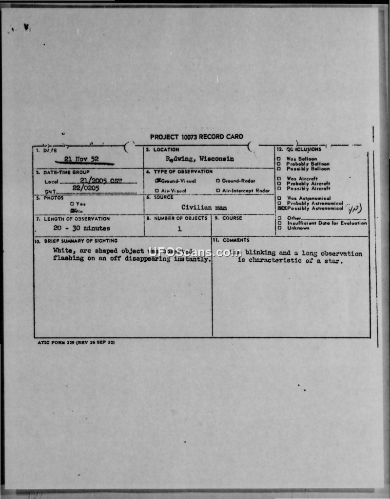 A civilian in Redwing, Wisconsin, reported a flashing, arc-shaped object on November 21, 1952. Military intelligence investigated the report and concluded the object was likely a star.
