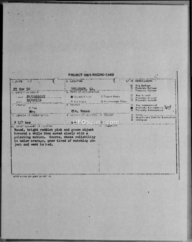 A civilian witness in DeQuincy, Louisiana, reported a 2.5-hour sighting of a pulsating, multi-colored object on November 27, 1952. The Air Force investigation, led by Captain Robert W. Smith, deemed the report unreliable due to the lack of corroborating evidence and the witness's low reliability rating.