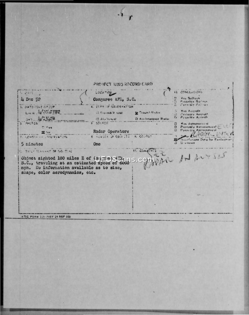 A radar-only sighting of an unidentified object traveling at 6,000 mph was recorded at Congaree AFB on 4 December 1952. The incident remains classified as 'Unknown' due to insufficient data to rule out radar interference.