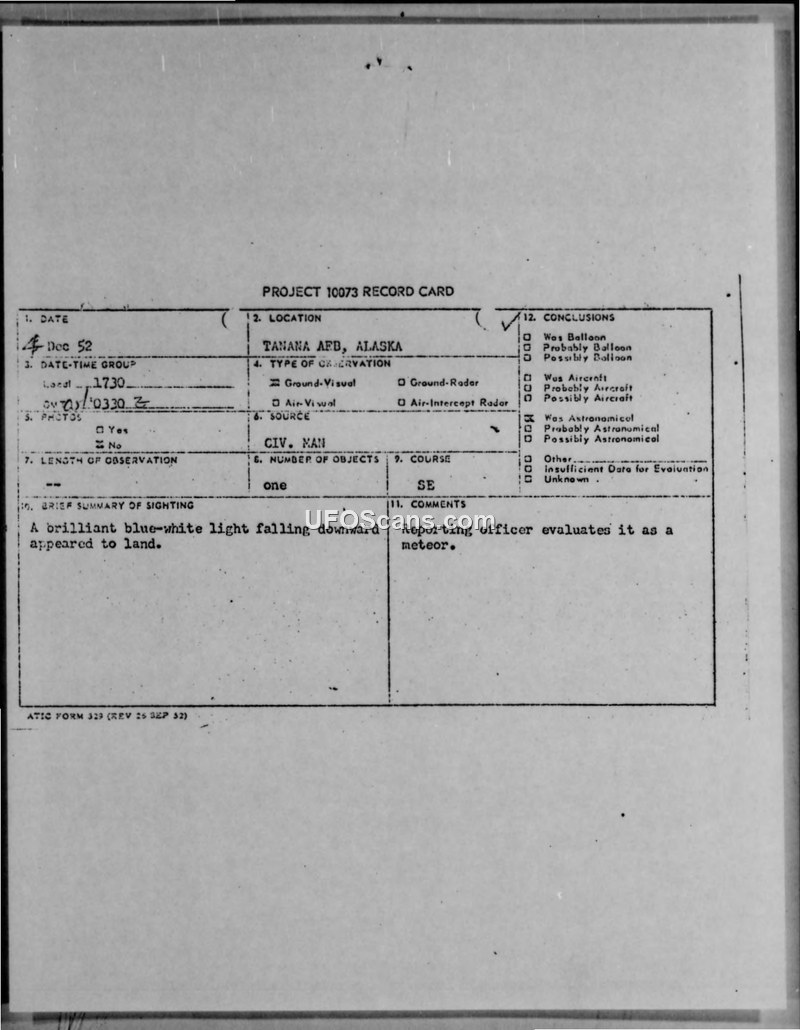 A brilliant blue-white light was observed over Tanana, Alaska, on December 5, 1952. Military authorities conducted an air search, which yielded negative results, and officially concluded the object was a meteor.