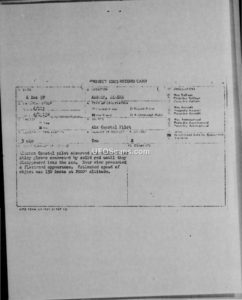 On December 6, 1952, at 1915Z, an Air National Guard pilot reported an unidentified aerial phenomenon near Angoon, Alaska. The pilot observed two shiny, globe-shaped objects connected by a solid rod, traveling in a southerly direction. The sighting lasted for approximately three minutes. The pilot noted that the objects appeared to have a flattened appearance when viewed from the rear and estimated their size to be comparable to a Grumman Goose aircraft. The objects were observed at an altitude of 2,000 feet, traveling at a speed of 150 knots. The pilot attempted to follow the objects until they accelerated and disappeared into the sun. Weather conditions at the time of the sighting were reported as clear. The pilot observed no lights, vapor trails, or exhaust smoke associated with the objects. Official analysis of the incident, conducted under Project 10073, concluded that the report was too sketchy and vague to reach a definitive conclusion. While the description was noted to be similar to reports of known upper air research balloons—a theory supported by the objects' apparent gain in altitude—the lack of specific wind direction data prevented investigators from confirming a correlation between the objects' flight path and upper air wind currents. Consequently, the official determination for the incident was that there was insufficient data to evaluate the phenomenon.