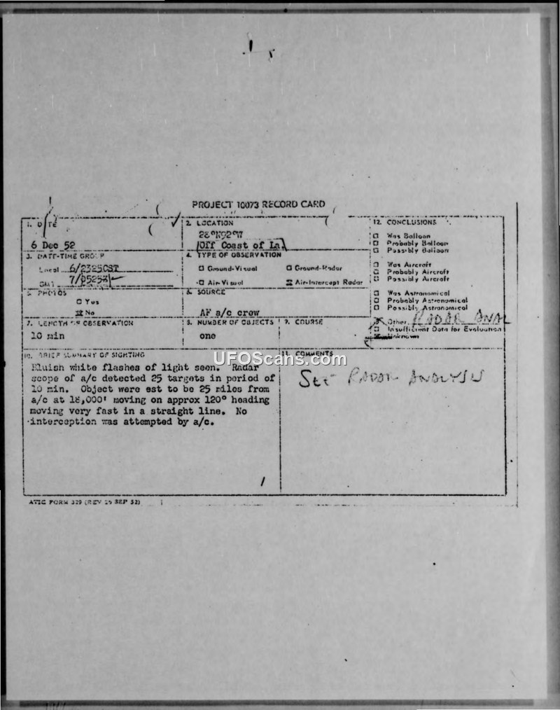 On December 6, 1952, a B-29 bomber piloted by Captain John Harter was flying over the Gulf of Mexico, approximately 190 miles from Galveston and 100 miles south of the Louisiana coast. At 2325 CST, while cruising at 18,000 feet in bright moonlight, the crew observed a series of unidentified aerial objects. The radar officer, Lieutenant Sid Coleman, detected 25 targets on the radar scope over a 10-minute period. The objects were estimated to be 25 miles from the aircraft, moving at high speeds on an approximate 120-degree heading. The crew reported seeing bluish-white flashes of light. The objects were described as moving very fast in a straight line, swerving, and at one point, merging into a large, half-inch curved arc on the radar scope before accelerating and disappearing. The crew, including the flight engineer, navigator, and gunners, confirmed the sightings both visually and via radar. The weather was reported as clear with no wind and excellent visibility. Despite the crew's extensive experience and the radar equipment functioning correctly, no interception was attempted. The incident was documented under Project 10073. Subsequent evaluations by the Air Technical Intelligence Center (ATIC) concluded that the sighting remained 'Unknown' after checking for all known aerial phenomena. The report emphasizes the crew's firm conviction regarding the reality of the objects, noting that they were not a malfunction or optical illusion. Later correspondence in 1961 confirmed that the object tracked by radar on this date remained classified as unidentified in the Aerospace Technical Intelligence Center files.