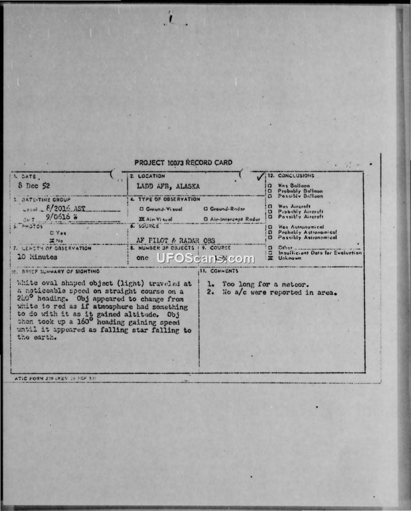 This document is a collection of records and correspondence regarding unidentified aerial phenomena (UAP) sightings in the vicinity of Ladd Air Force Base, Alaska, and Greenland during December 1952. The primary report concerns a sighting on December 9, 1952, by an F-94A crew (1st Lt. Donald A. Dickman and 1st Lt. Thomas W. Davies). The crew observed a white, oval-shaped light that appeared to be the size of a landing light at a distance of 0.5 to 1 mile. The object exhibited erratic flight characteristics, including changing color from white to red as it gained altitude, and eventually descending in a manner described as resembling a falling star or a helicopter. The object was not audible, and no propulsion system was observed. The weather was clear with VFR conditions and a temperature of -22 degrees. The radar observer, Lt. Davies, maintained visual contact throughout the landing maneuvers. Subsequent investigation by the 5001st Composite Wing and the Air Technical Intelligence Center (ATIC) noted discrepancies in the initial reports and requested further documentation, including flight path sketches and weather data. The document also includes reports of contrail sightings in Greenland, which were evaluated as potentially being from hostile reconnaissance aircraft, though later assessments suggested they might have been caused by friendly F-86 aircraft on classified missions. The records highlight the challenges of evaluating these sightings due to conflicting witness statements and the lack of physical evidence. The military authorities emphasized the need for accurate reporting in accordance with established procedures, such as the CIRVIS reporting system, and expressed concern over the improper use of 'flash' priority for messages that were later found to be based on inaccurate data.