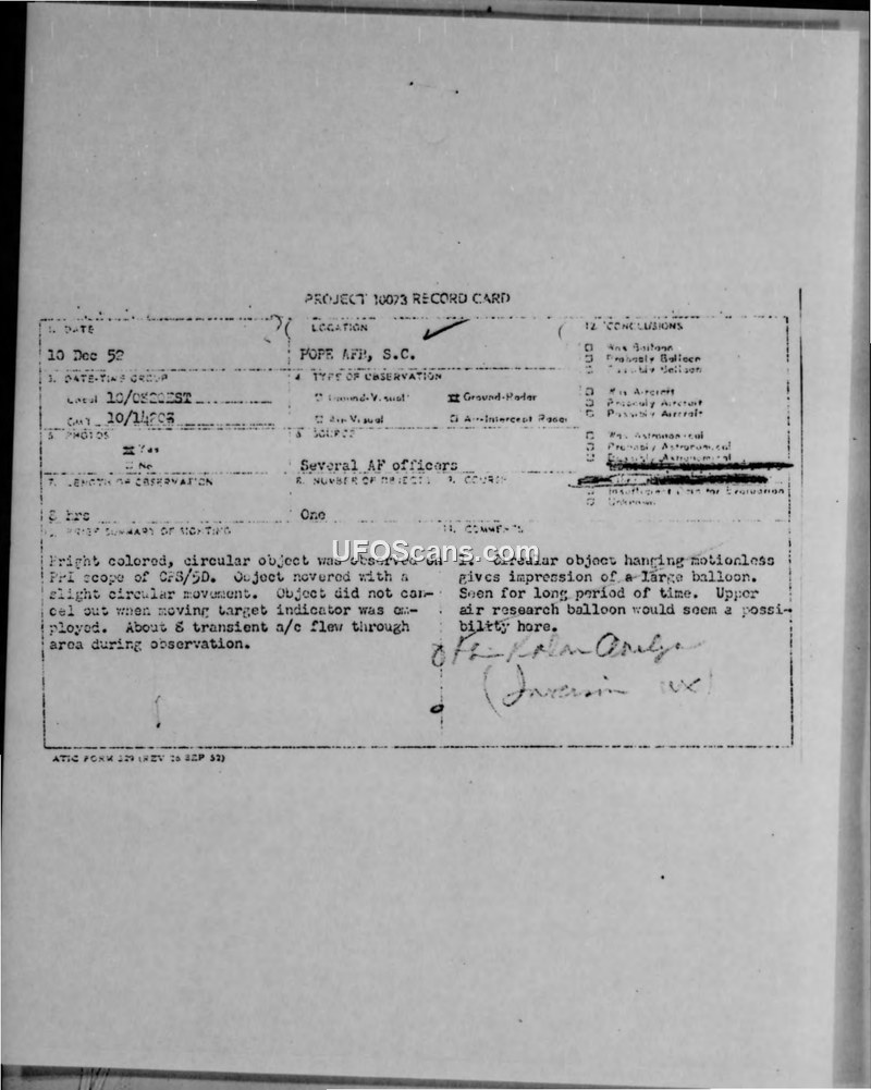 Project 10073 Record Card — Pope AFB, S.C. — 10 Dec 52