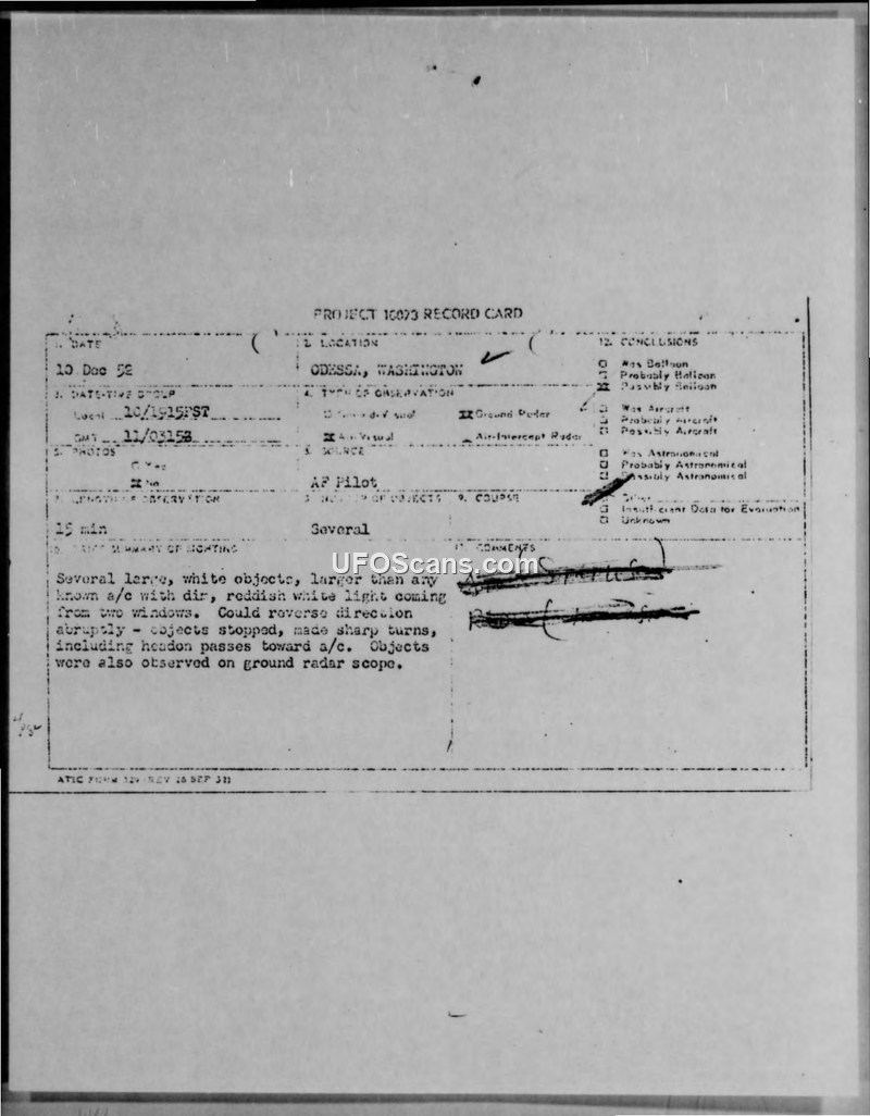Project 10073 Record Card: Odessa, Washington, 10 December 1952