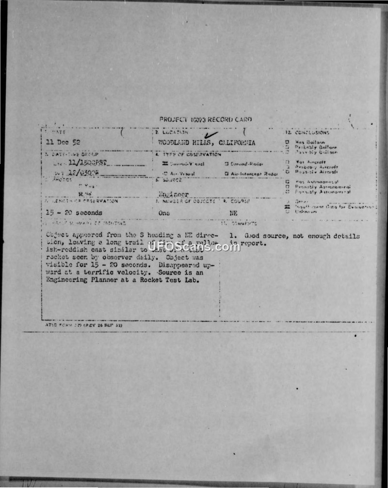 Project 10073 Record Card — Woodland Hills, California, 11 December 1952