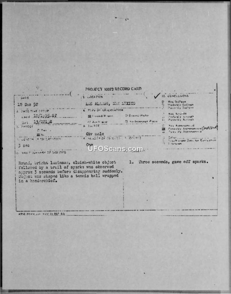 A security inspector at the Los Alamos AEC installation reported a round, luminous object with a trail of sparks on 12 December 1952. The Air Force investigation concluded the object was likely a meteor.