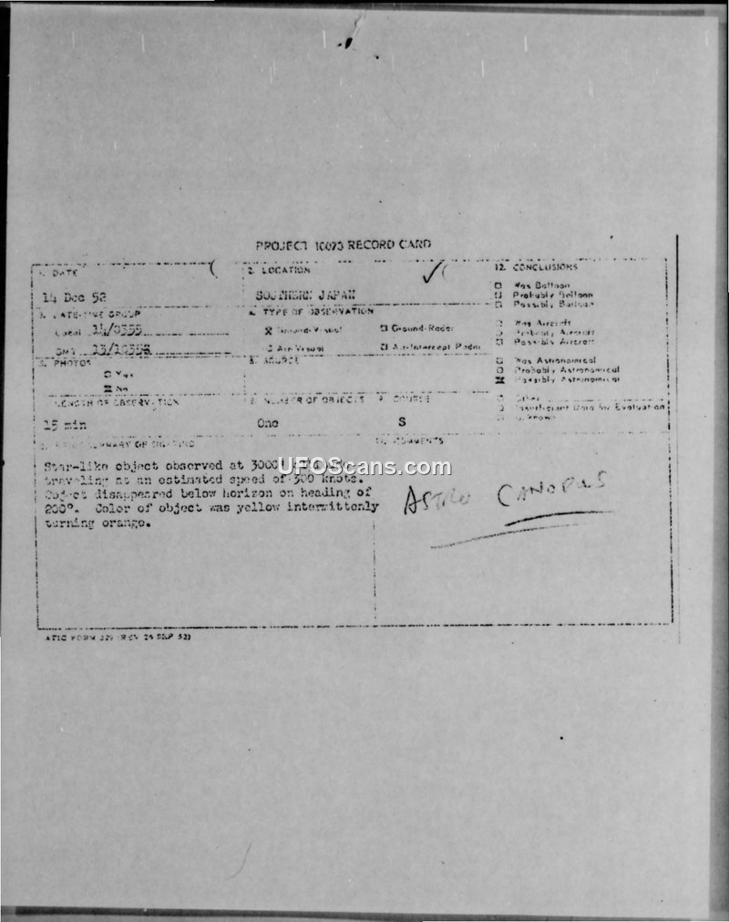 Three airmen in Japan observed a star-like object for 25 minutes that exhibited erratic movement and color changes. Intelligence officials concluded the sighting was likely astronomical in nature.