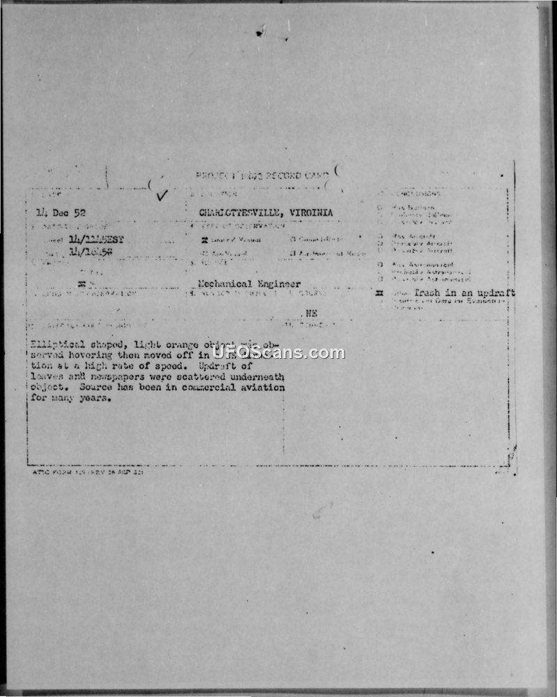 A professional aeronautical engineer and former test pilot reported a hovering elliptical object in Charlottesville, Virginia, in 1952. The Air Force officially concluded the sighting was caused by 'trash in an updraft.'