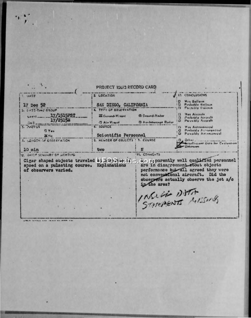 Four U.S. Navy Electronics Laboratory employees reported sighting two non-conventional objects over San Diego on 17 December 1952. The Air Force investigated the incident but closed the case with no further action, noting that the original witness statements were missing.