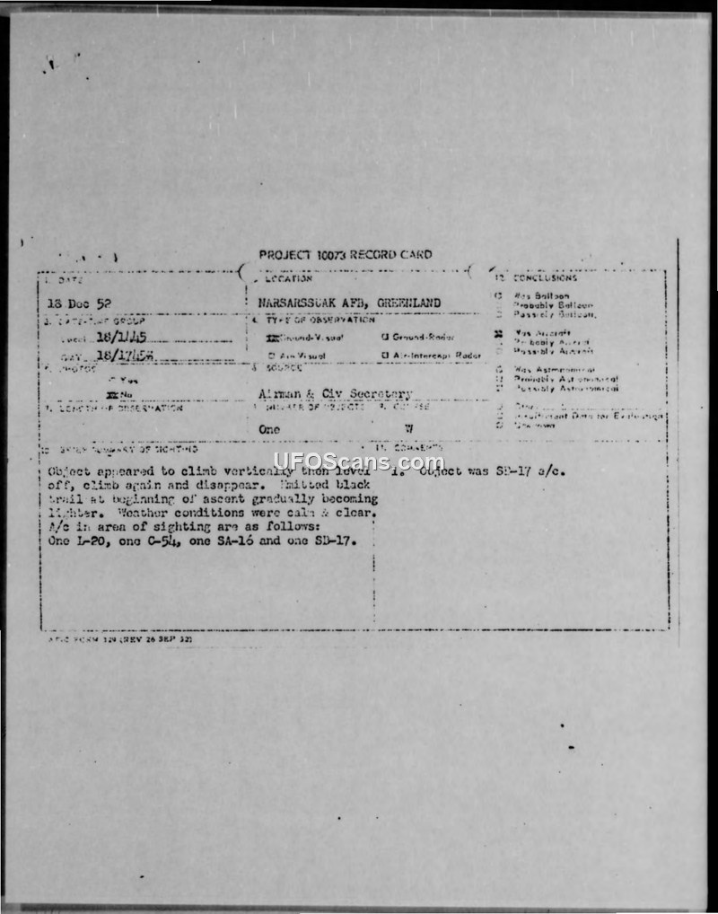 On December 18, 1952, at approximately 1745Z, an unidentified aerial object was sighted 10 to 15 miles northwest of Narsarssuak Air Force Base in Greenland. The sighting was reported by two observers: an Air Force Staff Sergeant and a civilian secretary from the base headquarters. The observers described the object as climbing vertically, leveling off, and then climbing again in a westerly direction before disappearing. The object was noted to have emitted a black trail at the beginning of its ascent, which gradually became lighter. Weather conditions at the time were reported as calm and clear. Several known aircraft were operating in the area during the incident, specifically an L-20, a C-54, an SA-16, and an SB-17. Following the initial report, the incident was communicated through multiple channels, including teletype messages to the Air Technical Intelligence Center (ATIC) at Wright-Patterson Air Force Base, Headquarters USAF, and Headquarters ADC. The base subsequently conducted an investigation and notified ATIC that the unidentified object had been definitively identified as the SB-17 aircraft that was present in the vicinity. The official conclusion reached by the reporting authorities was that the object was an aircraft.