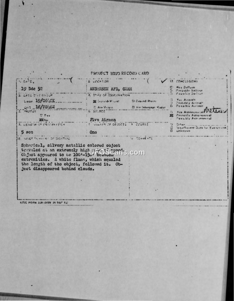 Air Intelligence Information Report: Unidentified Aerial Object Sighting, Guam, 19 December 1952