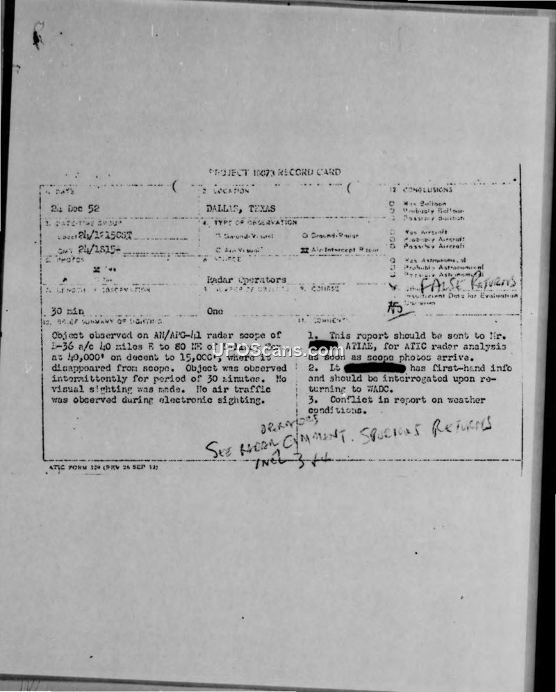Project 10073 Record Card — Airborne Electronic Sighting, Dallas, Texas, 24 Dec 52