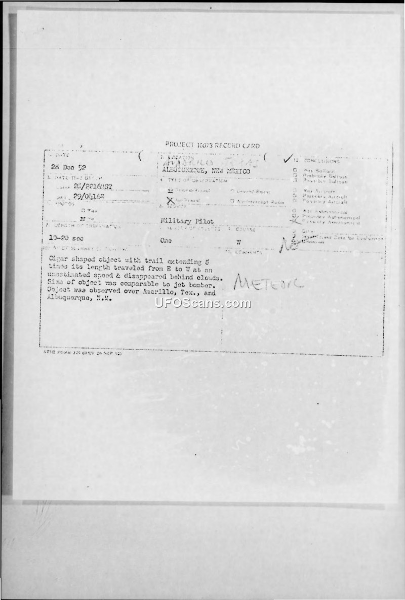 This Air Intelligence Information Report, dated January 15, 1953, documents a series of sightings of an unidentified aerial phenomenon that occurred on December 27, 1952, over Texas and New Mexico. The primary incident involved a Central Airlines pilot who, while taking off from Borger, Texas, at 2209 MST, observed an unusual, elongated, cigar-like object. The pilot reported that the object appeared to be at his altitude, traveling from east to west, and accelerating in a slight climb toward the northwest. The object emitted a bright white light and left a visible exhaust trail or contrail. Approximately six minutes later, at 2215 MST, CAA radio operators at Kirtland Air Force Base in Albuquerque, New Mexico, observed a similar phenomenon. This second sighting was corroborated by a Sandia Corp employee who was a known local astronomer. The witnesses described the object as moving from east to west, emitting a bright white light, and leaving a contrail. The object was observed to pass behind high broken clouds at an altitude of 30,000 feet. Despite the witnesses' professional backgrounds—including an airline pilot and radio operators—no radar contact was established with the object. Kirtland Tower confirmed that no military or civilian jets were in the area at the time, which led the reporting officer to dismiss the possibility that the object was a standard aircraft. The report includes detailed technical information sheets filled out by the witnesses, who provided sketches and estimates of the object's motion and appearance. The computed speed of the object was estimated at 2,700 MPH. The official conclusion of the report is that there was insufficient information to identify the object, though it notes that ATIC was in the process of checking the sightings against known meteor tracks. The document is marked as unclassified and includes a note that it was downgraded at three-year intervals.
