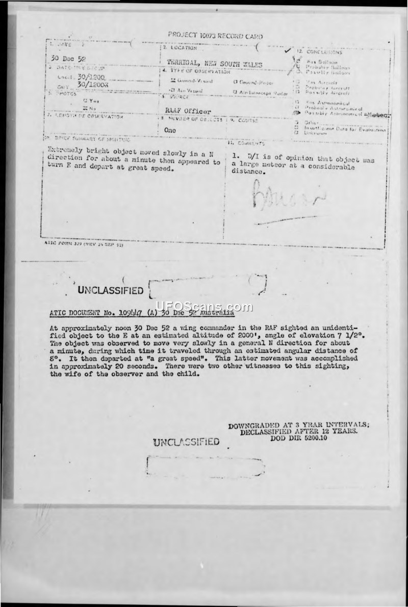 A RAAF Wing Commander reported an unidentified object over Terrigal, Australia, on December 30, 1952. Despite the witness's technical background and skepticism, the Directorate of Air Force Intelligence officially classified the object as a large meteor.