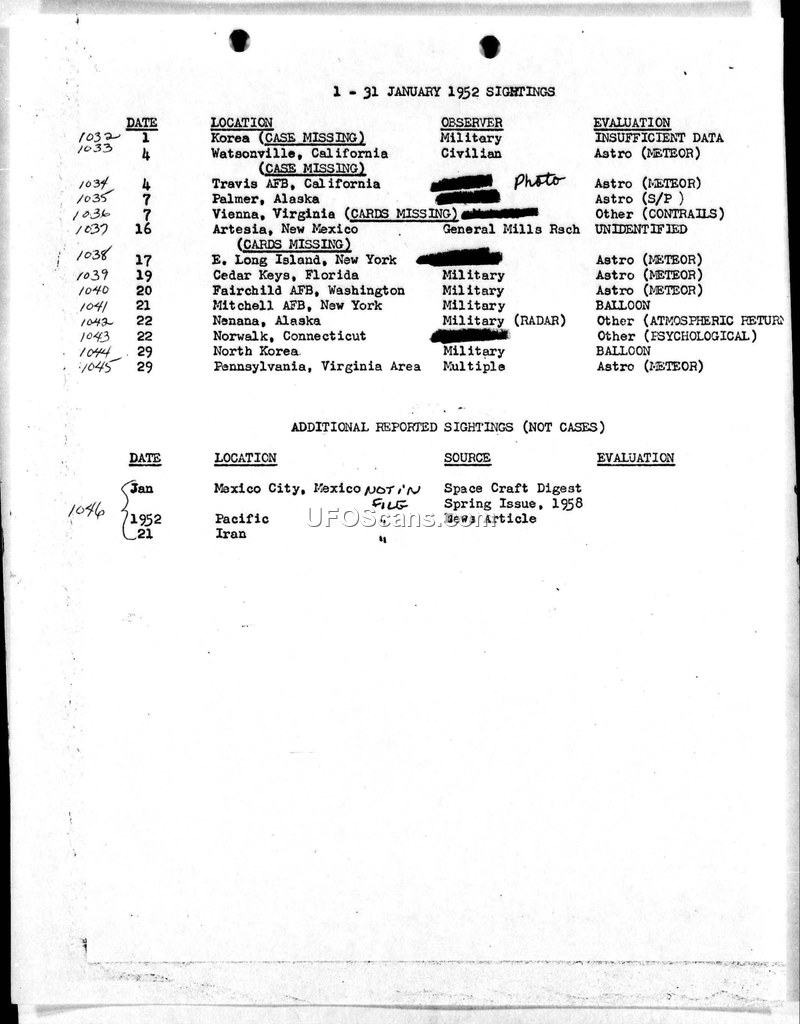 This document is a detailed chronological log of UAP sightings reported globally during 1952. It categorizes each incident by date, location, observer type, and official evaluation, serving as a primary record of the reporting activity during that year.
