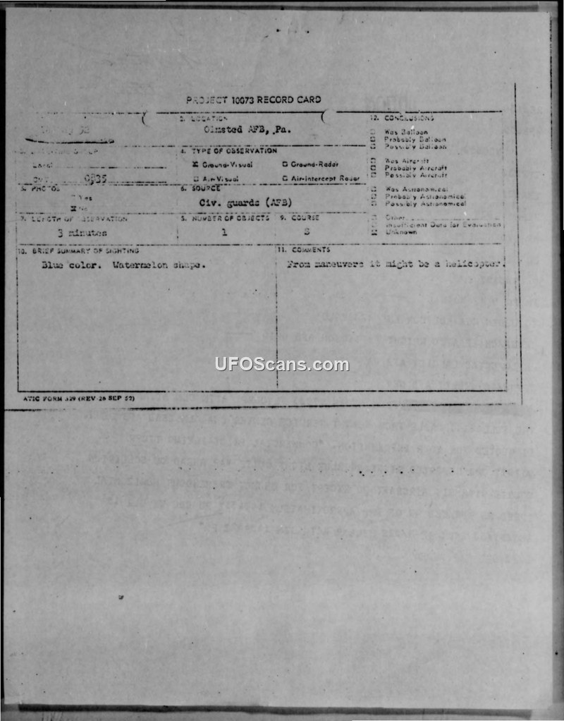 This document collection contains multiple reports and correspondence regarding Unidentified Aerial Phenomena (UAP) sightings occurring in September 1952. A primary report involves a sighting on September 14, 1952, in Fairfax, Virginia, by a 39-year-old female kindergarten teacher. The witness described observing a 'super brilliant white object' that was 'watermelon shaped' and approximately six to twelve inches in diameter. The object was surrounded by a light brown circle about six feet in diameter. The witness noted that the object moved at 'terrific speeds' and performed maneuvers that led her to speculate it might be a helicopter, although she noted no sound was heard. The sighting lasted approximately three minutes. The documentation includes a Project 10073 record card, an observer questionnaire, and various military cables. One cable from the Flight Service Center at Olmstead AFB, Pennsylvania, references a commercial pilot flying 'Tiger N67977' who reported a blue light on a collision course with his aircraft. Additionally, the file contains an Air Intelligence Information Report (IR-147-52) from the Air Attache in Turkey, dated September 25, 1952, which details a separate sighting by three technically experienced USAF airmen. These airmen reported a large, light grey object, estimated to be 300 feet wide and 15 feet high, moving at an estimated 2,000 miles per hour at an altitude of 15 miles. The report includes a sketch of the object's configuration. The collection reflects the systematic military effort to collect, document, and evaluate these reports under the auspices of Project Blue Book and Project 10073, with internal communications requesting clarification on garbled messages and coordinating the analysis of sketches and descriptions provided by witnesses.