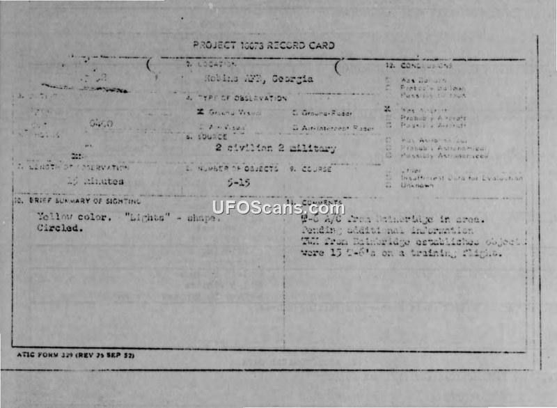 Project 10073 Record Card and Air Intelligence Information Report — Robins AFB, Georgia, September 1952