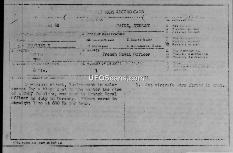 A French Naval Officer reported an egg-shaped, luminescent object over Mainz, Germany, on 29 September 1952. The report notes the presence of C-47 and F-84 aircraft in the area at the time of the sighting.