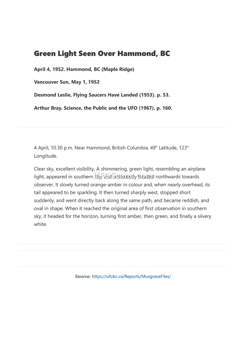 On the night of April 4, 1952, at approximately 10:30 p.m., an unidentified aerial phenomenon was observed near Hammond, British Columbia, at 49° Latitude and 123° Longitude. Under conditions of clear skies and excellent visibility, a shimmering green light, described as resembling an airplane light, was seen in the southern sky. The object moved noiselessly in a northward direction toward the observer. As it approached, the object's color shifted to orange-amber, and its tail appeared to be sparkling. Upon reaching a position nearly overhead, the object executed a sharp turn to the west, stopped suddenly, and reversed its course along the same path. During this maneuver, it changed to a reddish color and assumed an oval shape. After returning to the original area of observation in the southern sky, the object proceeded toward the horizon, transitioning through colors of amber, green, and finally a silvery white. This account is documented in the Musgrave Files and referenced in publications by Desmond Leslie and Arthur Bray, as well as the Vancouver Sun.