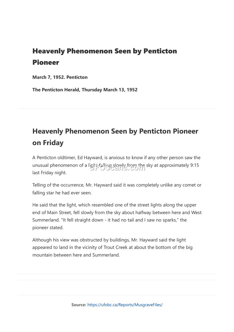 A Penticton resident reported seeing a light fall from the sky on March 7, 1952. The witness described the object as resembling a street light and noted it lacked a tail or sparks.